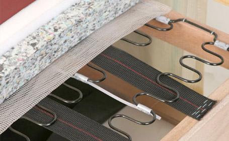 S型のバネをアーチ状に並列に取り付け、座り心地を重視したホールド感のある感触が得られます。ウエービングベルトは伸縮性のあるゴムベルトを格子状に張っております。